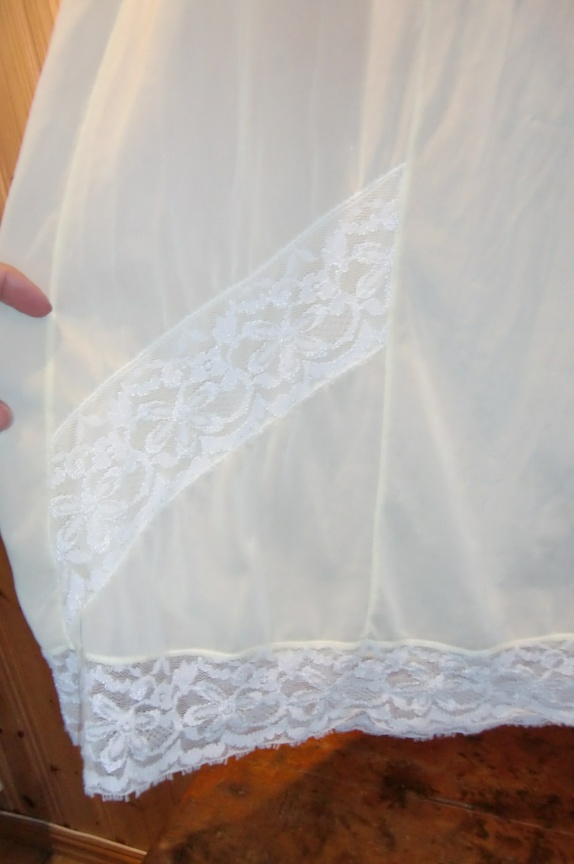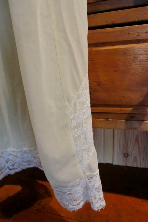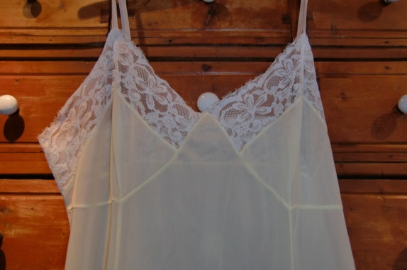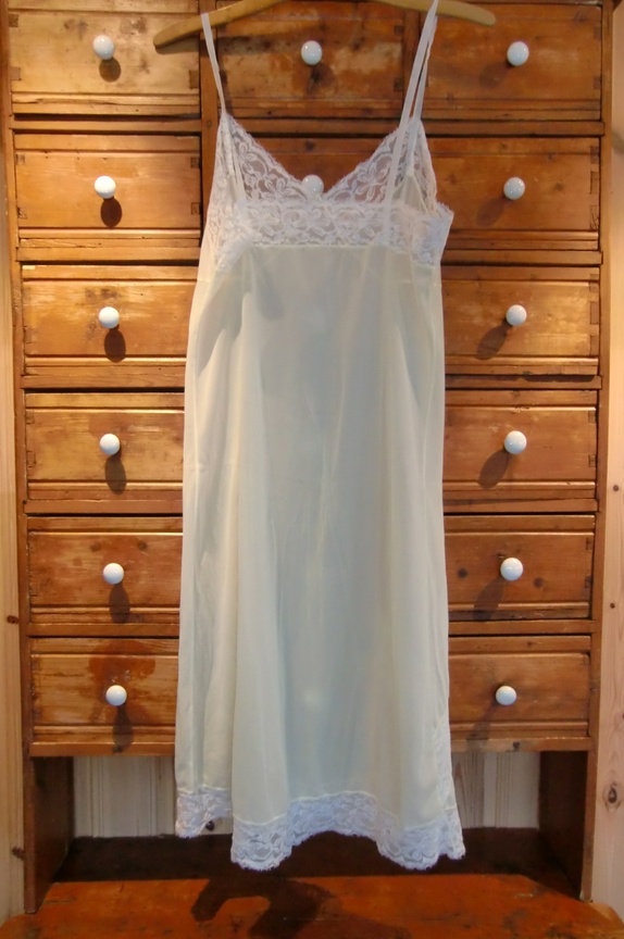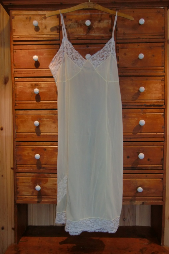 Fin underkjole i lyse gult fra 60-70 tallet. Et lite hull i blonden har jeg sett.Str.M tror jeg, i står det 44, men den må være mye mindre...