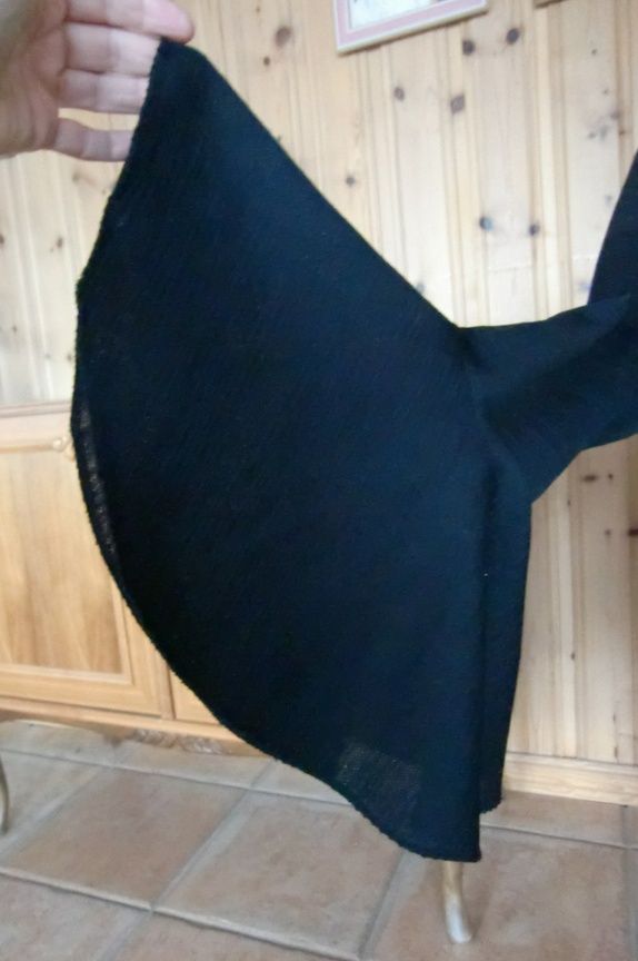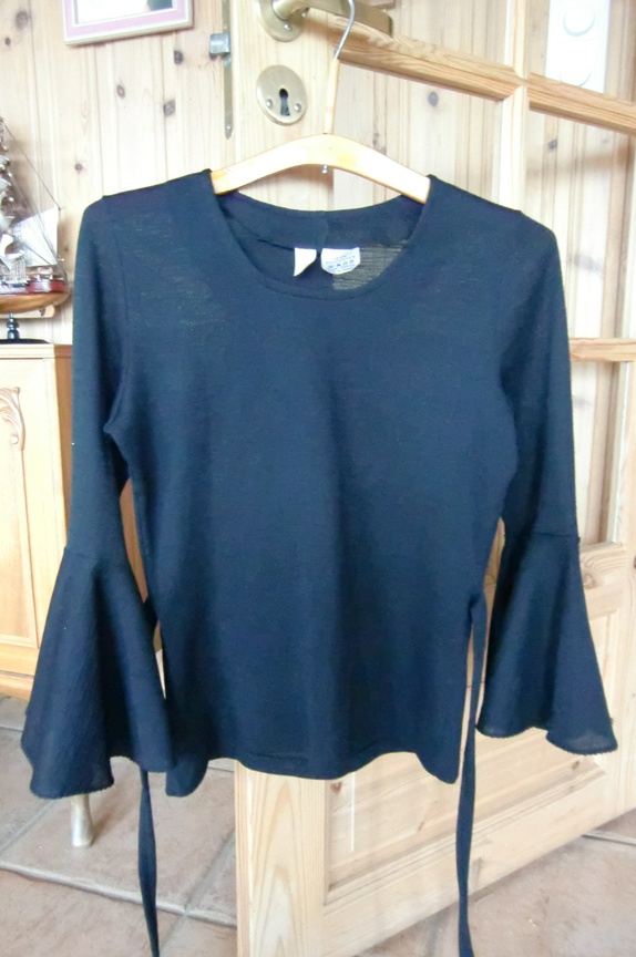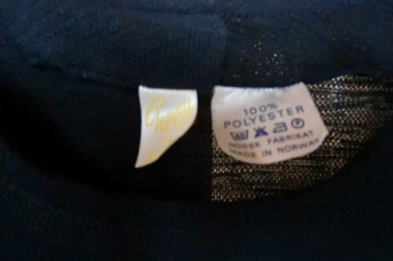 100 % polyester,norsk fabrikat. Svart.. Str. 42, men jeg vil tro den er mindre.. en 38 kanskje? Polyester nupper, så litt nupper er det her og der. Kul til et party el. vintage elskeren.