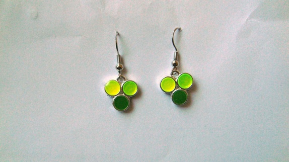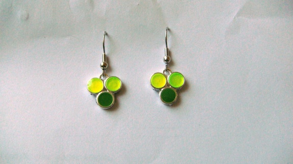 Øredobbene er i grønne nyanser med sølv farge rundt.. De er 1,5 cm lange uten ørekrok.