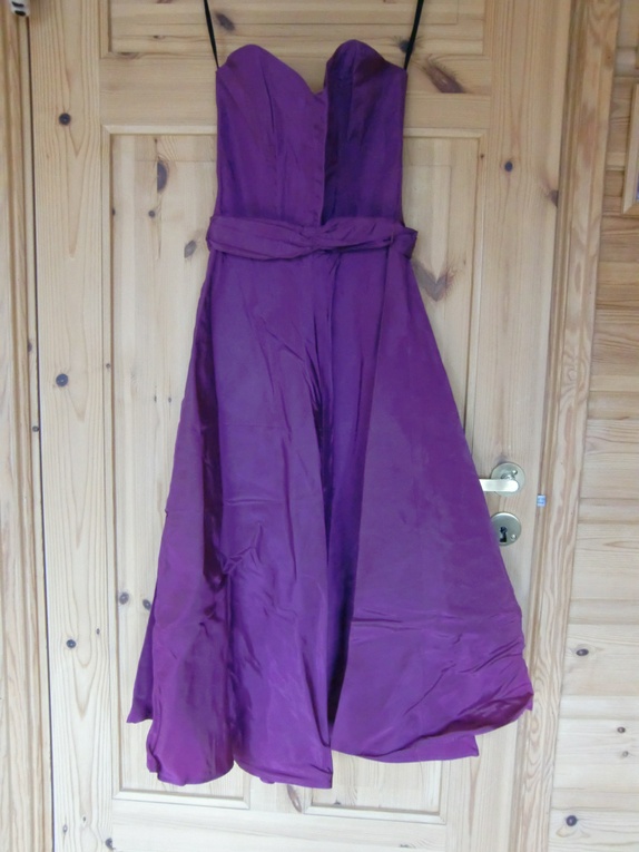 NY PRIS; FRA 299,- TIL 199,- ser at etter bretting (ligget slik en stund nå) har dessverre den ene spilen som er hvit kommet litt fram i sømmen. Sys enkelt/gjemmes igjen m/ nål og lilla tråd. Fortsatt en flott kjole!