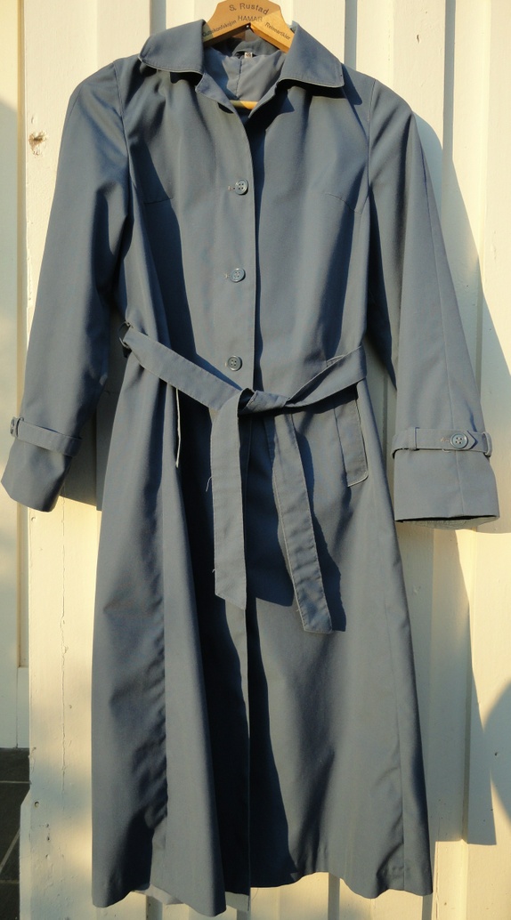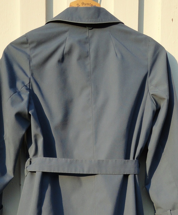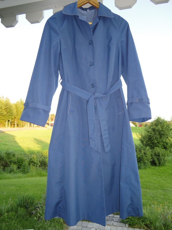 Tøff og søt, gammelblå, vintage (60-talls) sommerkåpe/frakk/trenchcoat, for jenter som liker å være litt tøffe, selv om de er søte (eller omvendt). Fine detaljer ved kragen, ermene og lommene. Tilhørende belte. Fôret. Det synes at denne er brukt, men den er på ingen måte utslitt, og holder nok lenge ennå. Ingen hulle eller flekker, og beltet og alle knappene er fortsatt på plass.