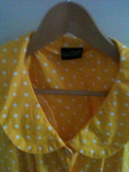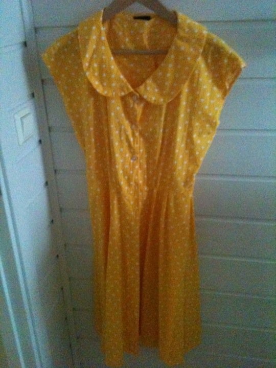 Sommerlig Rock Steady kjole med knyting bak. Gul med hvite prikker og peter-pan krage. Ikke spesielt mye stretch i stoffet. Lenge ca til kneet.