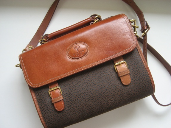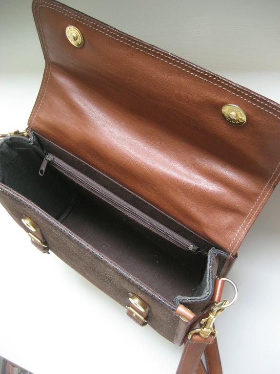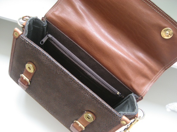 Skinnveske av merket "Pigeon 7910". Alder usikkert, muligens vintage.Innvendig ser den ubrukt ut, utvendig noe slitasje ellers i god stand.Skulderreimen kan taes av og den er justerbar.