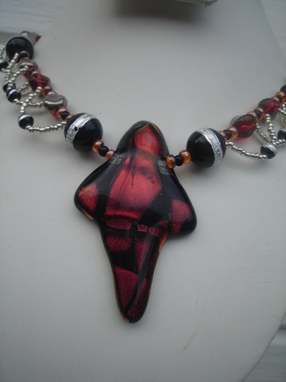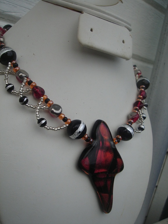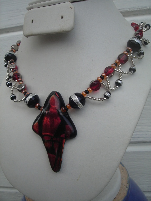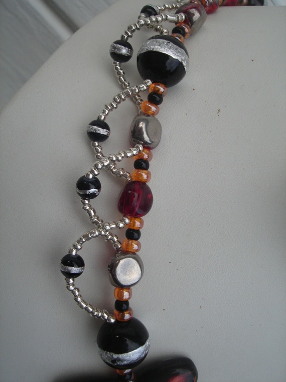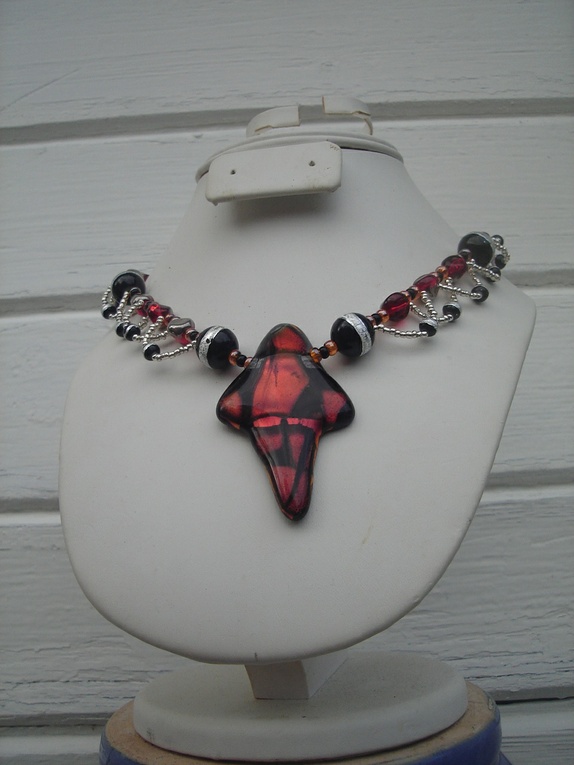 Bruker farga tinntråd, effektgarn, fiskesene til å sy med, wire, vokset bomulltråd, lær, små kjettinger, knapper, støper ansiktsanheng i gips og bruker fimoleire i noen. ALLE SMYKKENE ER UNIKE..