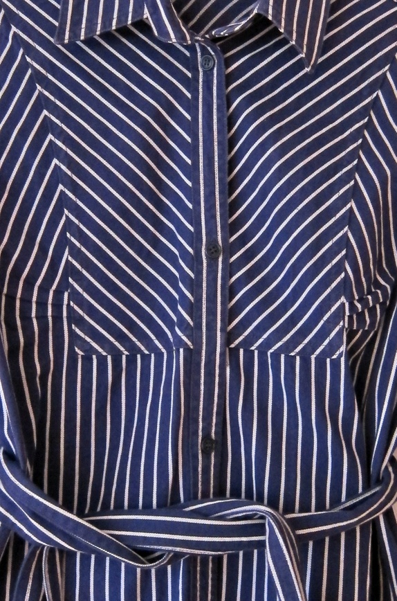 Blå bomullskjole fra svenske Whyred i solid kvalitetsstoff med hvite striper, lange ermer og belte i livet. Størrelse 40. Med ekstra knapp.