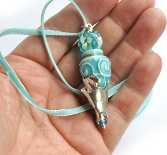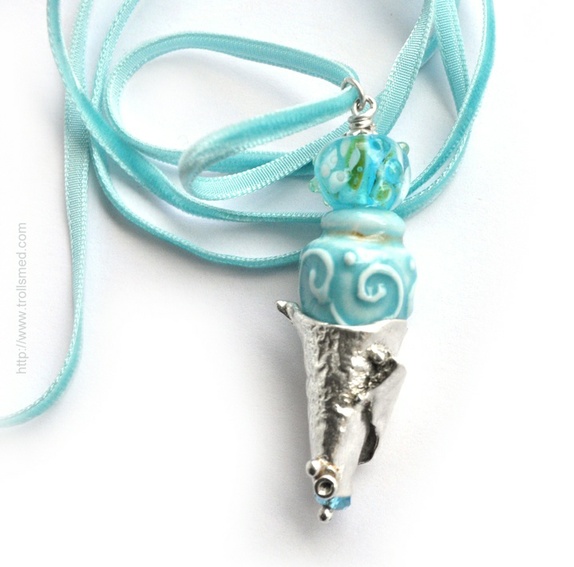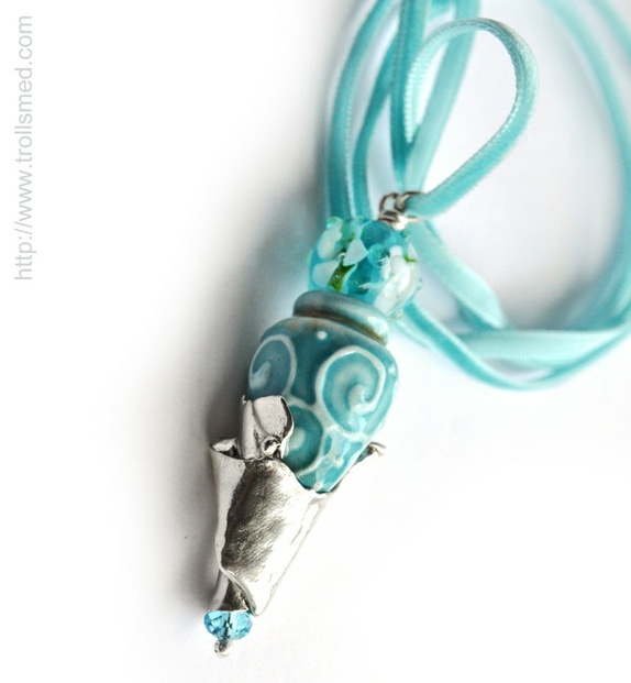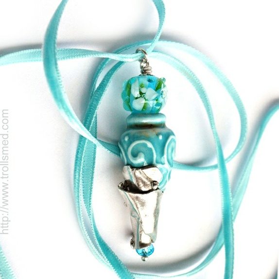 Et herlig håndlaget smykke i sølv, håndlaget porselen og håndlaget glass. I sannhet et unikt smykke som ingen har maken til.Se hånda for størelse. Det henger i en fløyelssnor. men jeg legger ved en kraftig bommulsnor som alternativ.