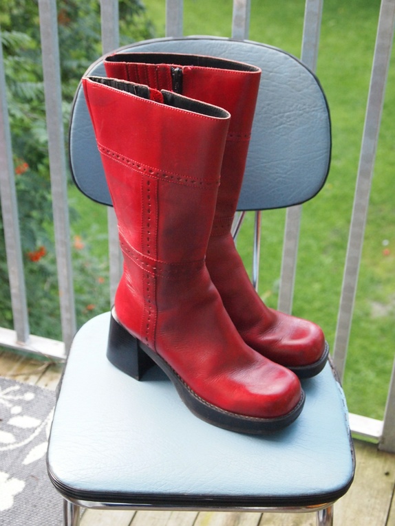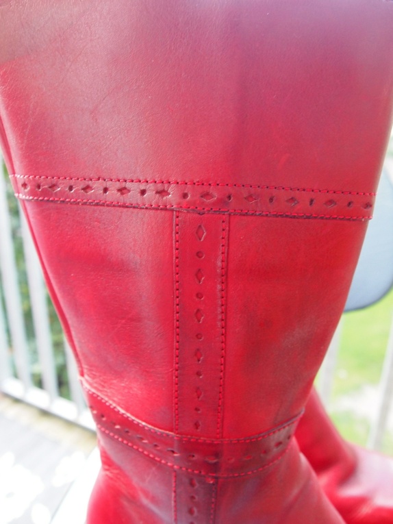 70-talls boots i skinn, nydelig dyp rød farge.. tilsvarer ca str 38. Høyde 35 cm, glidelås på innsiden.. strecth øverst i kanten