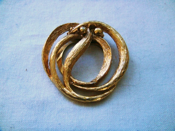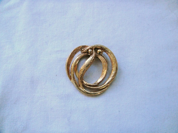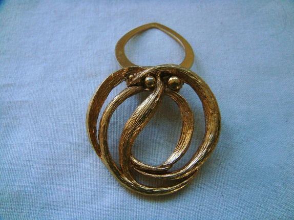 Skjerf / tørkleringen er gullfarget og ca 4 cm i diameter. Fra 70 tallet.