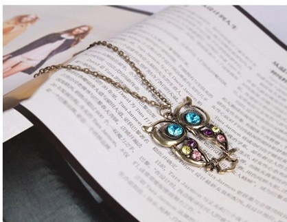 Fargerikt uglesmykke Lengde på kjede: ca 69 cm Ugla: ca 1,5 x 5 cm