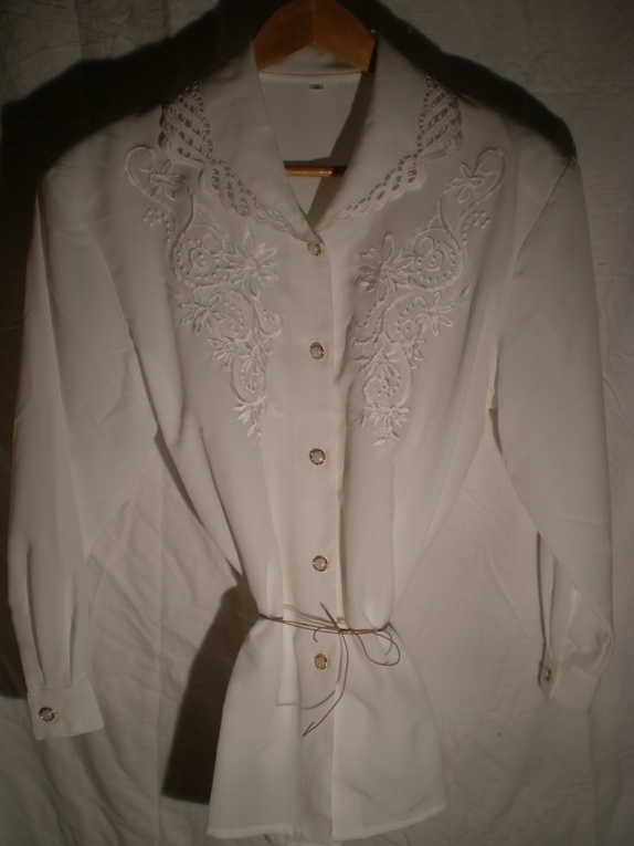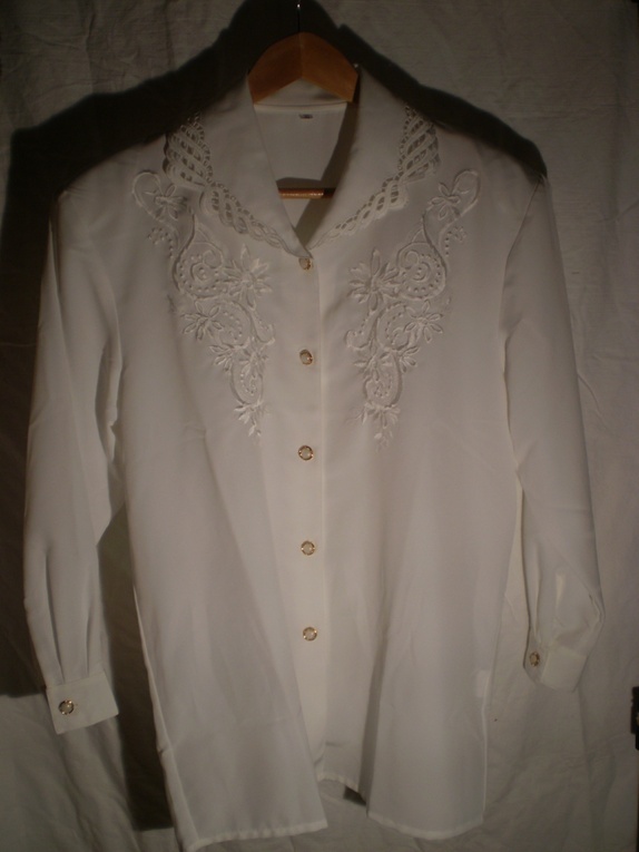 Kremhvit blondebluse med nydelige broderier på bryst og krage samt fine gullknapper.Oppgitt størrelse er 36 men det er stor i størrelsen.