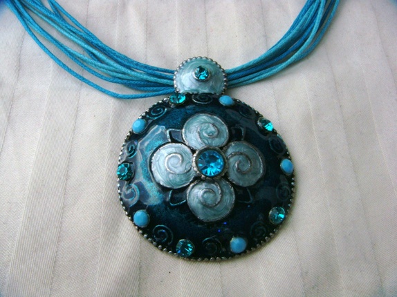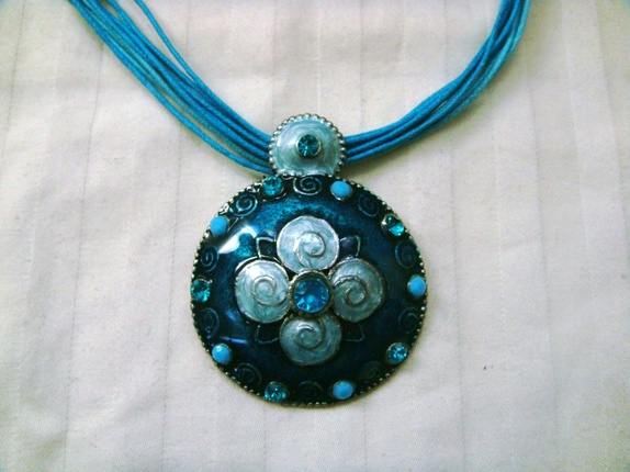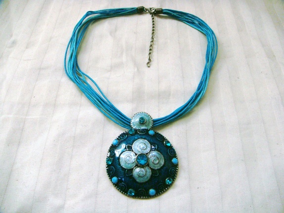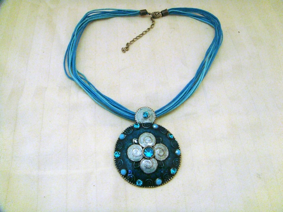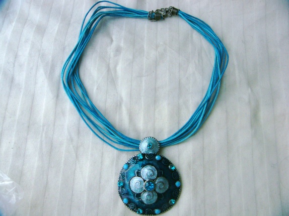 Flott kjede /blå toner.Kjedet som er av smykketråd er 40 cm + forlengelseslenke og anheng. .Anhenget er 6 cm langt og bredden er 5 cm.Det er festet smykkestener på anhenget.