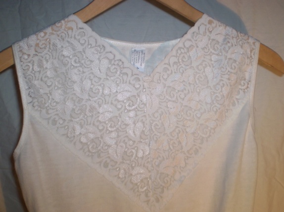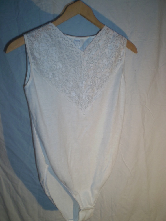 Kremhvit body i ull og bomullsblanding med fine blonder i halspartiet. Veldig fin inni skjørt/shorts/bukse under en jakke. Fremstår som ny. Str 4, passer medium/large.