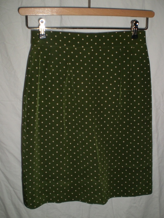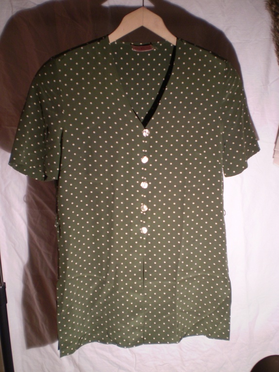 Olivengrønn bluse med hvite prikker. Vintage Betty Barclay i 100% silke. Str 36, men den er ledig og vil passe 38 også. Fargen er varm og er slik den fremstår på bildet av skjørtet som hører til.