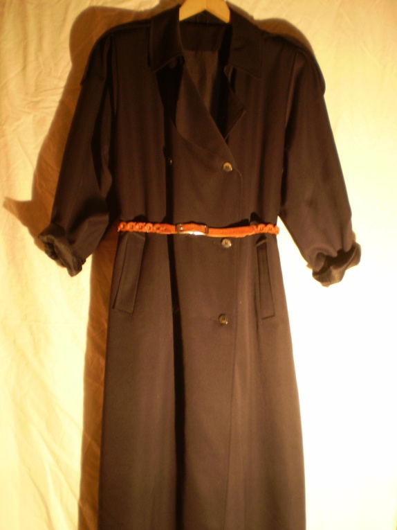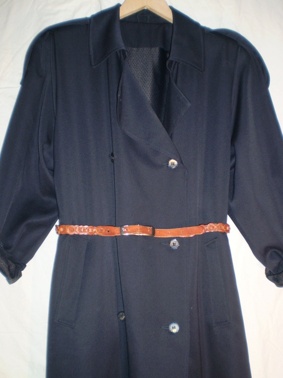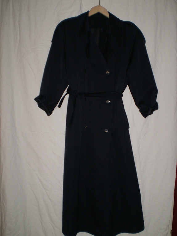 Marineblå klassisk trenchcoat av Dansk merke. Den fremstår som nesten ny uten slitasje. Stoffet er ullblanding og den har små skulderputer. Str 40