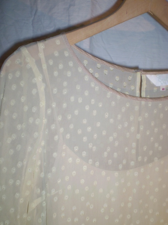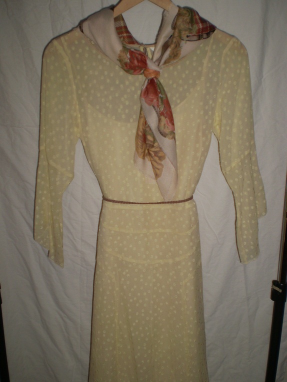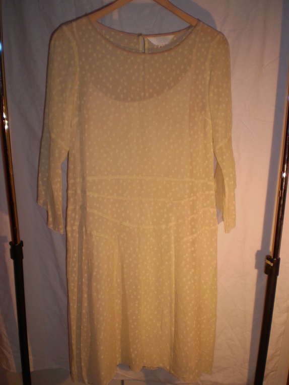 Nydelig Noa Noa kjole i silkeblandig. Den er lys gul med prikker og det hører til en fin underkjole i samme nyanse. Det er en liten rift bak i halsen som jeg har sydd så det preger ikke kjolen. størrelse medium