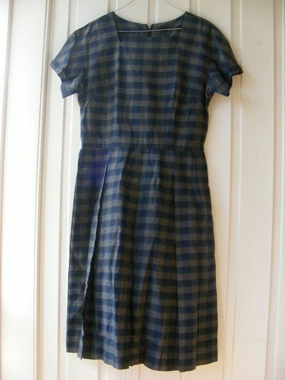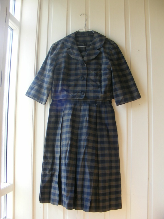Det er en tidlig 60-talls kjole i blå, grå og sortrutete mønster, med tilhørende jakke. Spesiell og flatterende halsåpning, og et stort og fint skjørt. Jakken har 3/4 arm og store knapper.