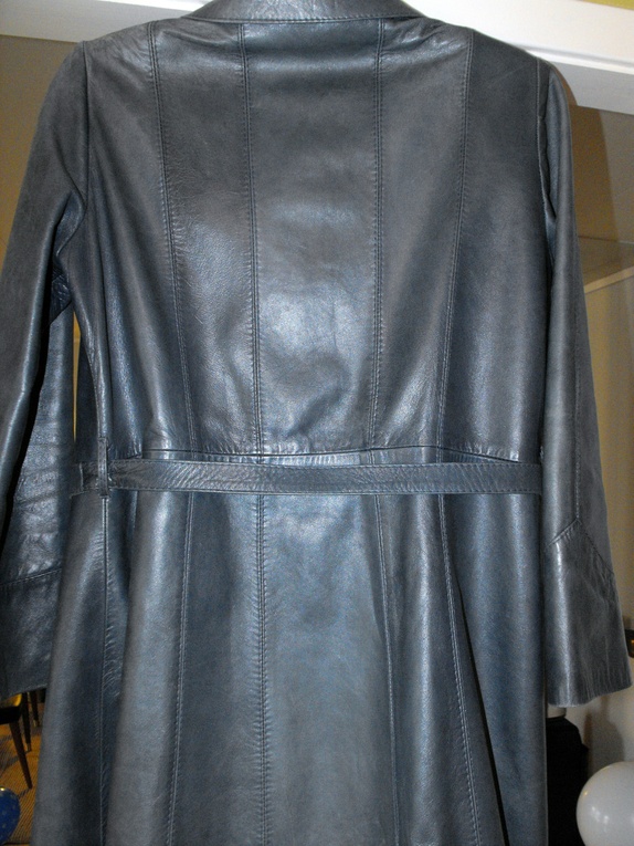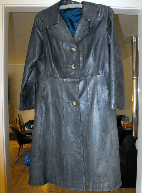 Stilig skinnkåpe i mørk petrol farge med knytebelte. Mjukt skinn, fint snitt og flotte detaljar.