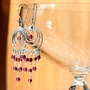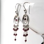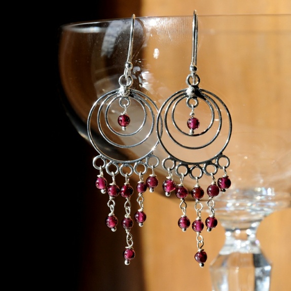 Ørepynt i etnisk bohemstil, håndlaget i sterling sølv og med et dryss av ekte, nydelige små granatperler i en dyp,varm rødfarge. De er mørkere på farge i kveldslys enn på hovedbildet.