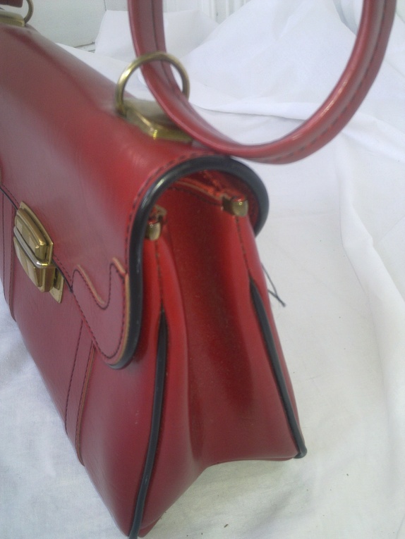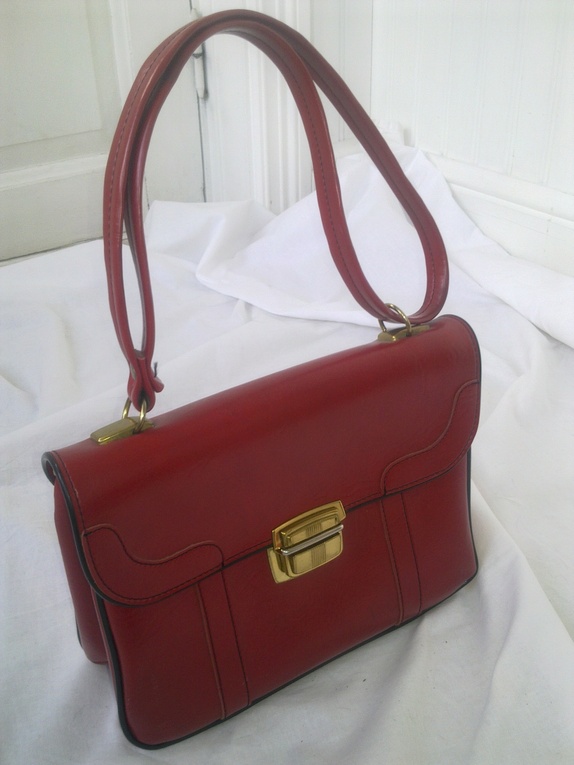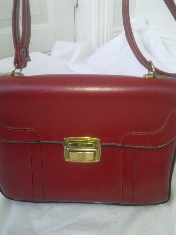 Rød i skinniimtasjon. Skulderrem som kan kortes endel inn.