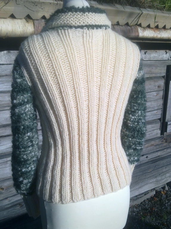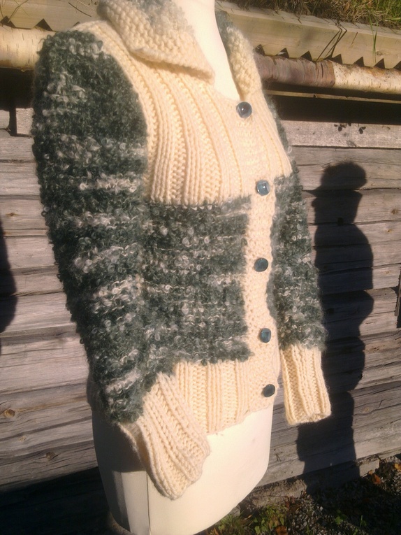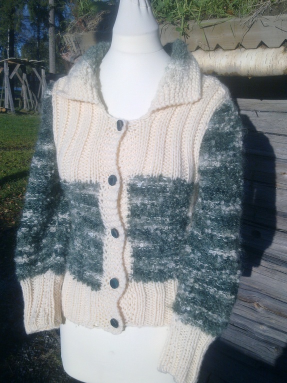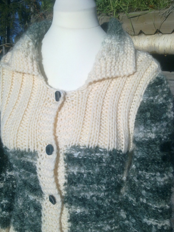Hjemmestrikket ulljakke. Fine knapper. Den passer nok beste strørrelse small/medium.