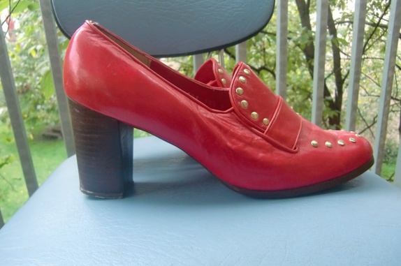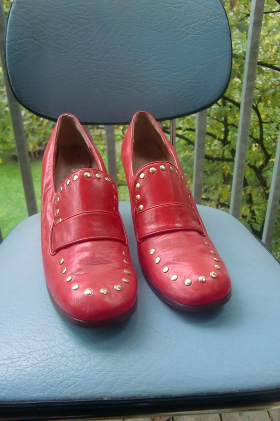 Sko i rødt skinn, 70 talls disko stil, gullnagler, høy hæl ca 5 cm.Merket str 10,5 laget i spania. ca str 40 - 41
