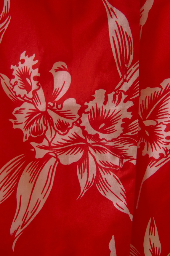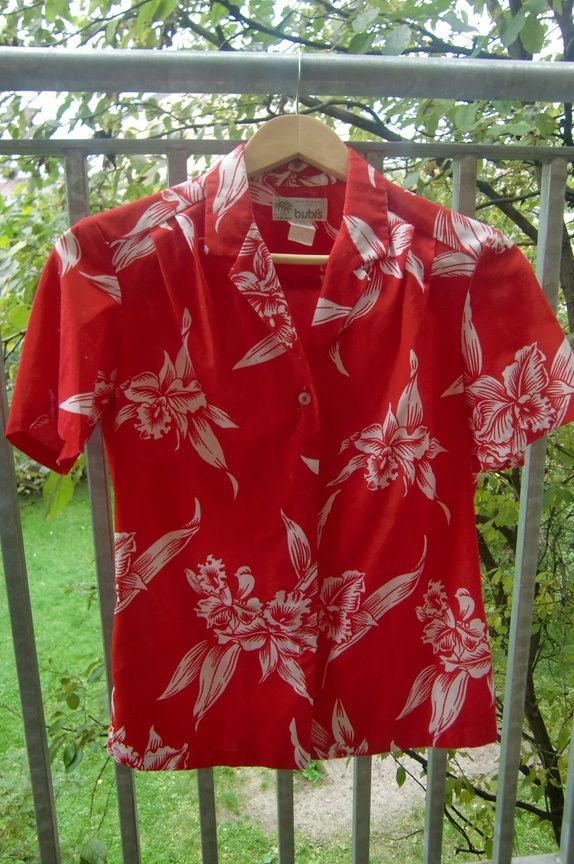 Rød og hvit Hawaii-skjorte, Merket str L men tilsvarer ca M, ca 40 cm fra skulder til skulder100 % bomull