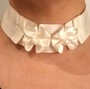 Lekkert shokersmykke i hvit sateng med perler, origamiteknikk. Bredde 4 cm, halsvidde 35 cm, lukning borrelås, unik design, kun en av hver,