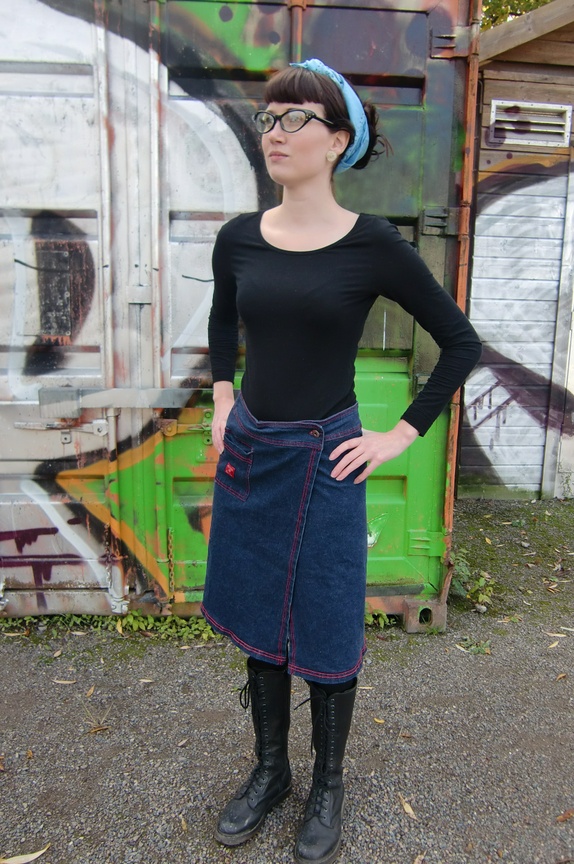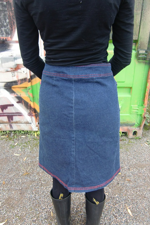 Demin omslagsskjørt med røde sømmer "Hot Kiss" Merket med str 9, tilsvarer ca M, god stretch
