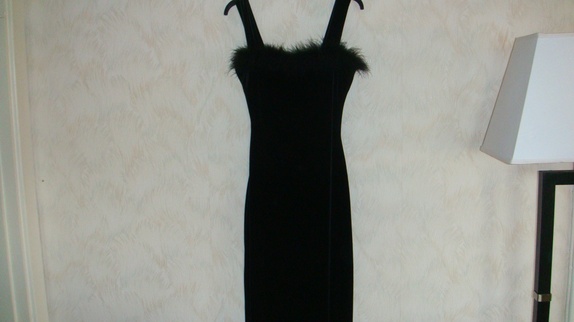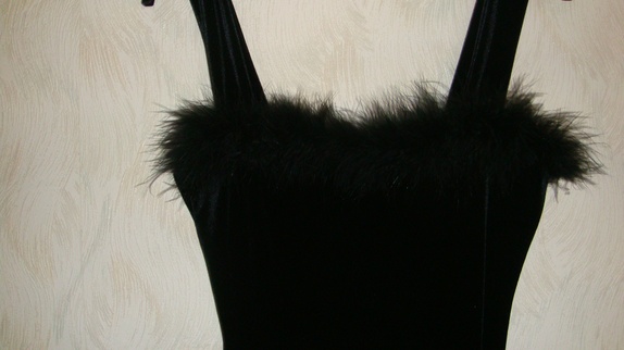 Kjolen er i 90% polyester og 10% elasthanne(som gir en overflate av speilvelur eller nervøsfløyel)Rundt hals utrigningen foran på kjolen er det juksepels.Det er en smal modell med splitt midt bak.kjolens hele lengde med stropper er 145 cm.
