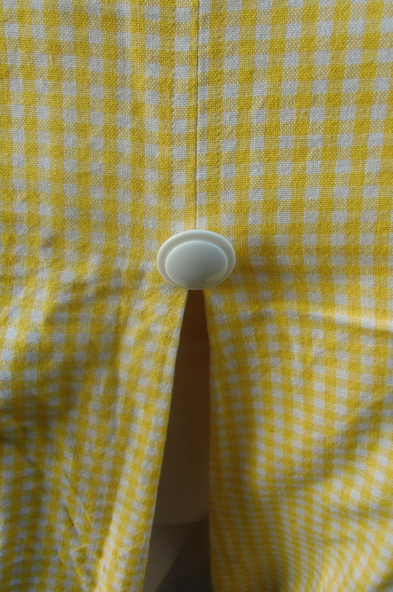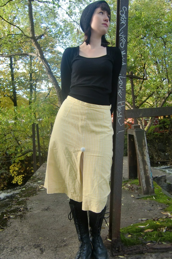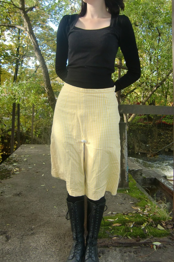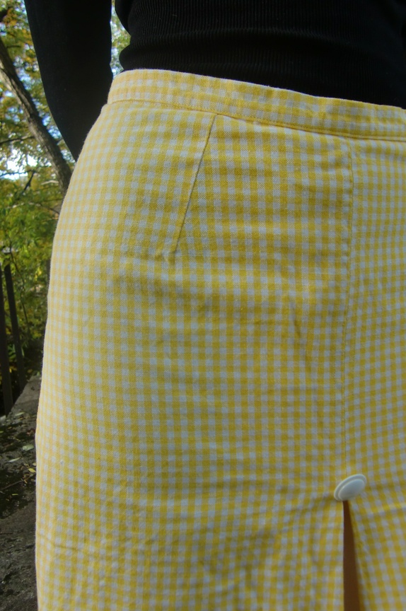 Skjørt i gult og hvit, C. Øberg Oslo,str L.36 cm i livetsøt detalj med knapp øverst i splitt foran.