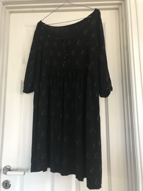 Deilig, sort tunika i viskose med print av brunrosa pusekatter. Rund hals og 3-kvart arm med en liten knapp.