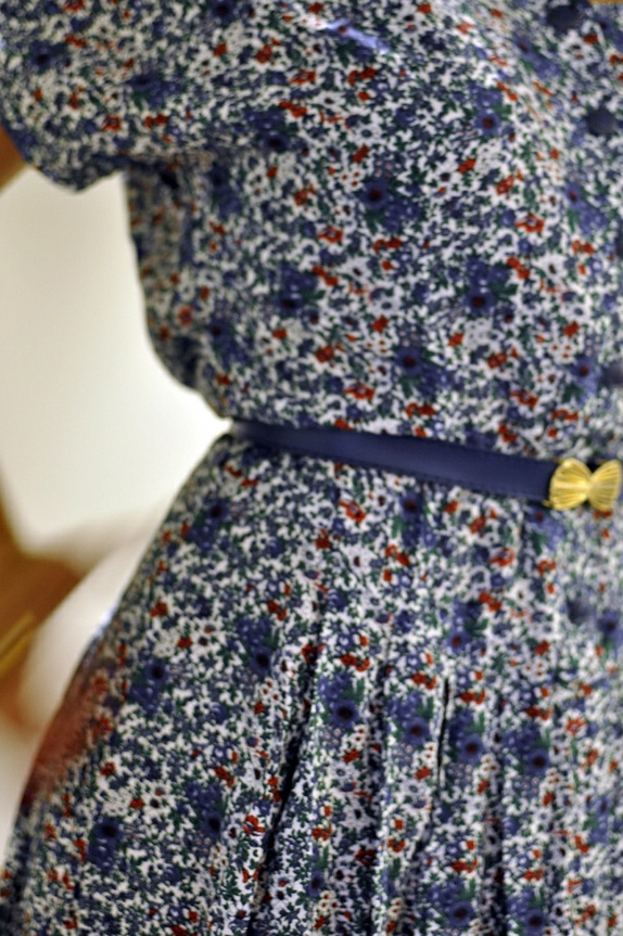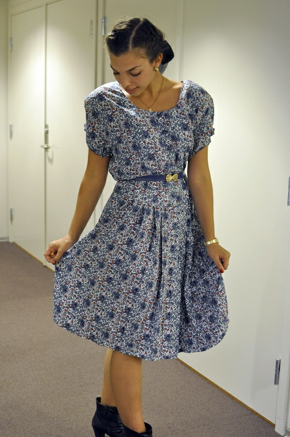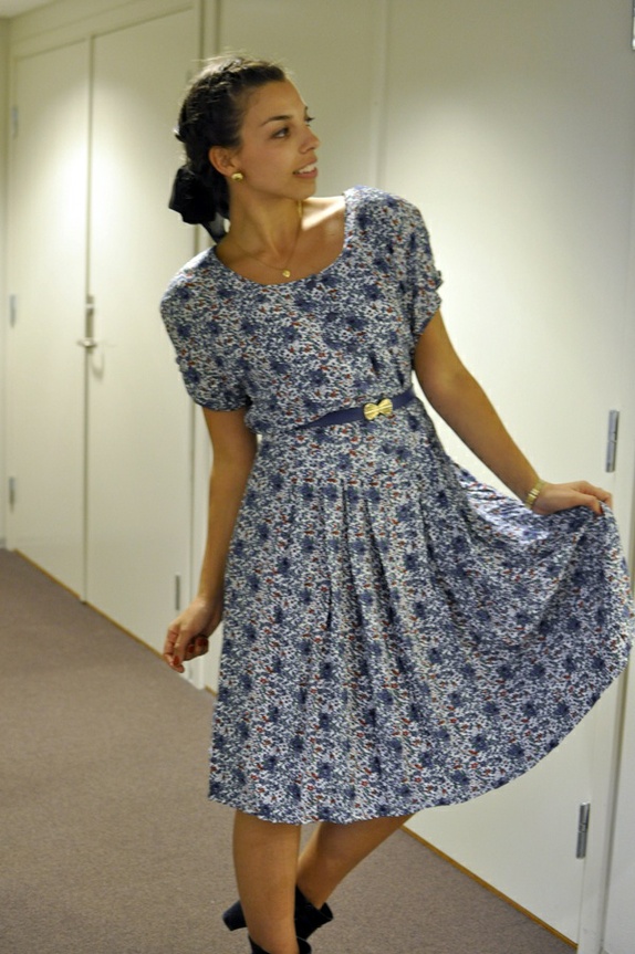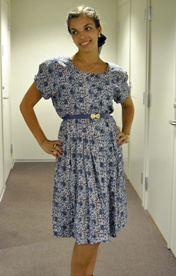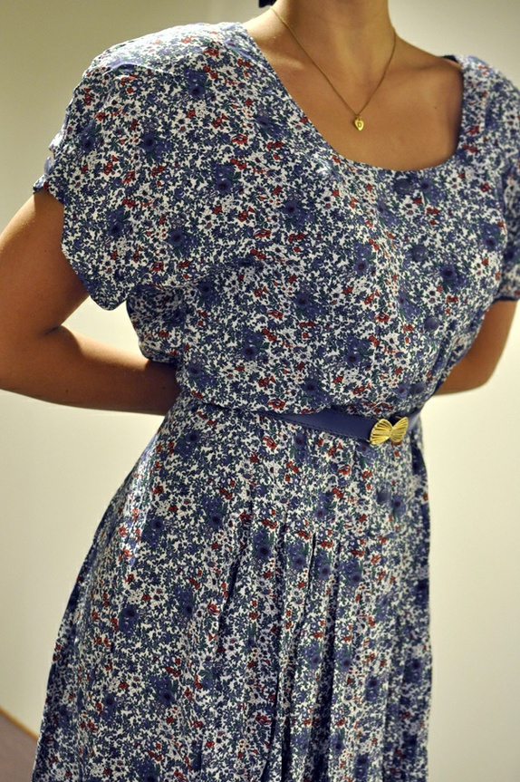 Helt nydelig vintage kjole fra slutten av 80-tallet (eller kanskje tidlig 90-tall) Kjolen er full av søte små blomster med bunnfarge blå, hint av hvitt og rødt.