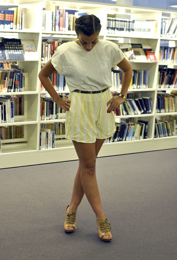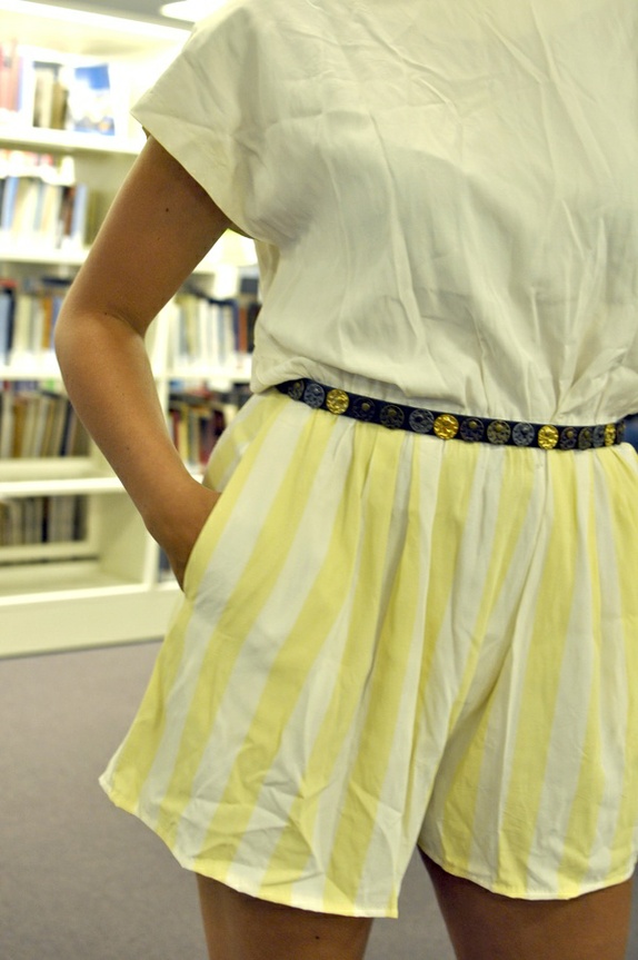 Kjempesøt playsuit fra 70-tallet. Det ser ut som to deler med hvit overdel og gul shorts med hvite striper, men så sitter de faktisk sammen. Drakten er kjempekul med belte i livet, den har også søte lommer på siden.