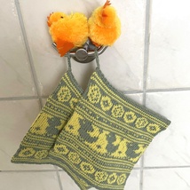 Heklet gryteunderlag, dobbelt, i lys gul, gul, orange og gressgrønn.