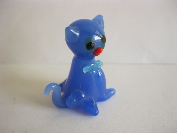 Bittelite dyr, glassdyr, fin liten katt i blått glass. Vakker blå farge, rød nese. Kan være italiensk, men jeg vet ikke. Bare 3 cm høy. Feilfri. - Ved kjøp av flere ting er frakt umulig å forutsi, antagelig 70 kr, maks 130 kr.