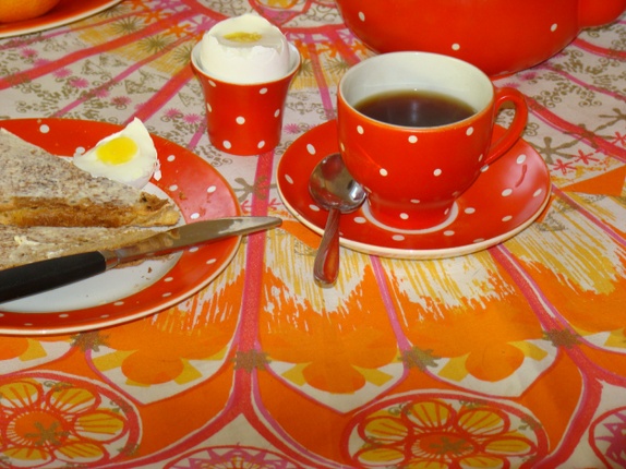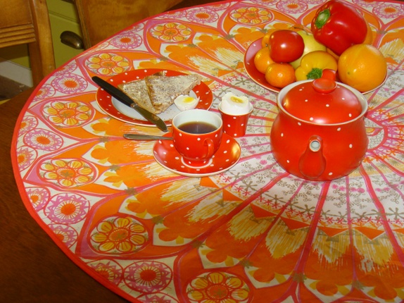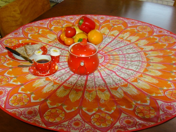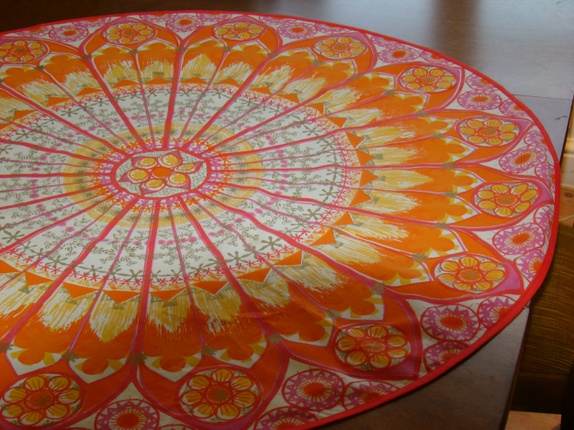 Rund duk i bomull. Rosa og oransje med noen gulldetaljer. I veldig fin stand. Fargene på bildet gjengir fargene i virkeligheten. Duken måler 100 cm i diameter.