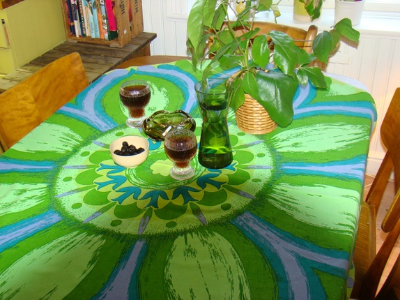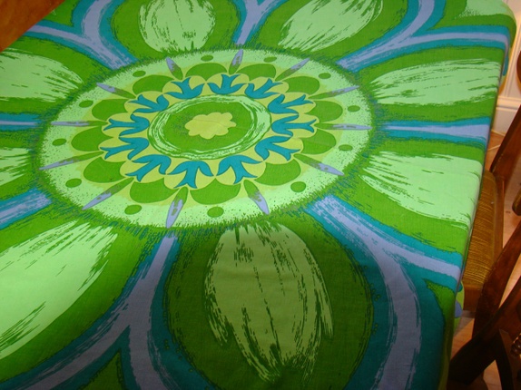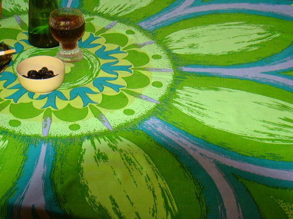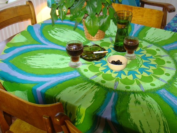 Rund stor duk i robust bomull. Duken er i veldig fin skikk, ser lite brukt ut. Den sterke fargekombinasjonen i grønt, blått og lilla taler for at den stammer fra 60- eller 70-tallet. Fargene på bildet gjengir fargene i virkeligheten.