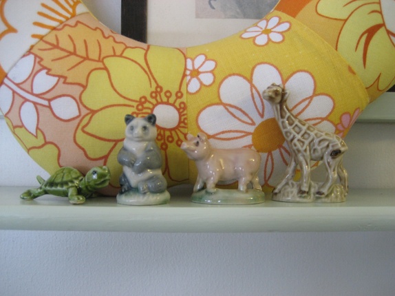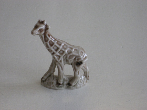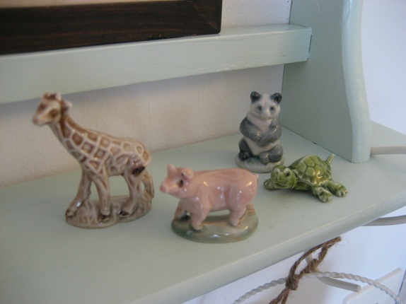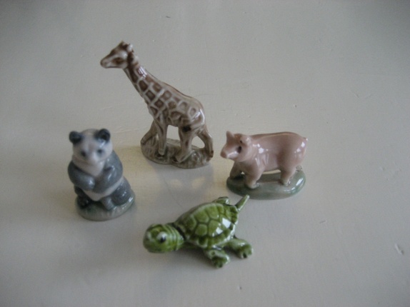 Små, søte porselensfigurer; sjiraff, gris, panda og skilpadde.