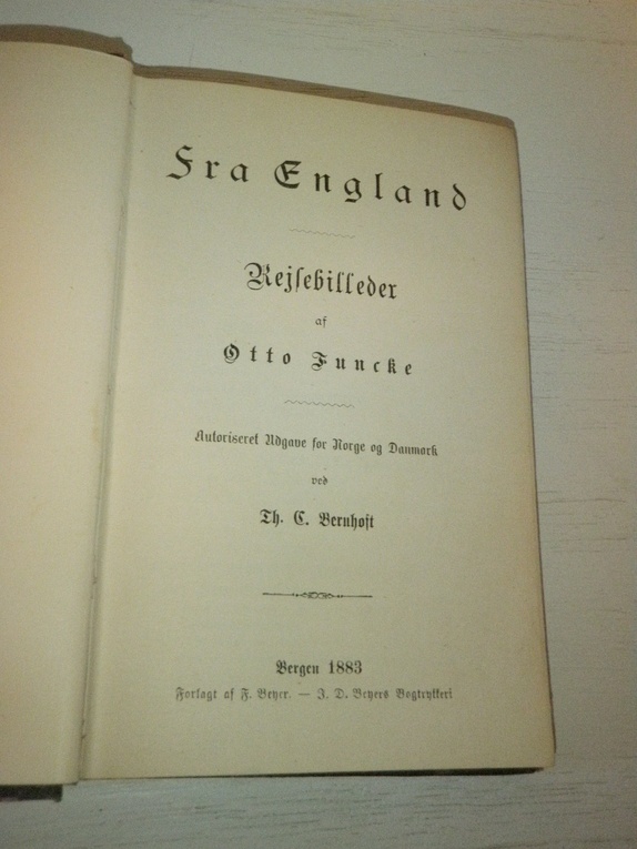 Tittel: Fra England - Reisebilleder av Otto FunckeBergen 1883Gotisk skriftBoken er hel og i ganske god stand