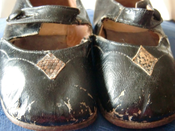 Skjønne, gamle,brukte barnesko i str. 20 i skinn/lær og med slangeskinnsdekor. Skoene er fra 1910-1920. Skoene er i skinn med ordentlige skomakerarbeid : sømmer, samt spikrede hæler, også de i lær. Hele, men slitte. Gått mange små skritt i disse…