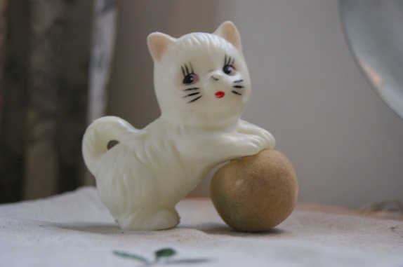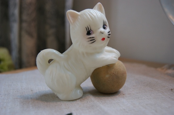 Søt plastkatt m. ball. Høyde ca 9 cm.