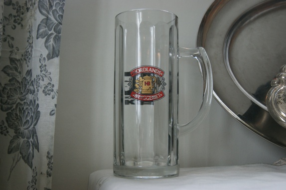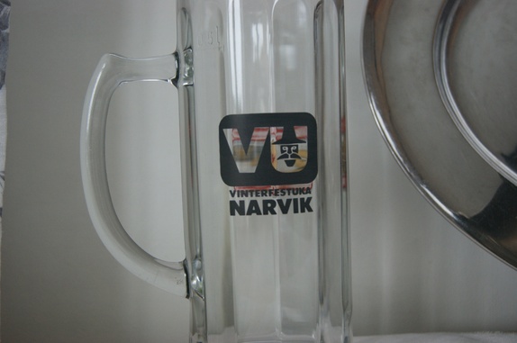 Halvliters glass med hank og nordlandsbryggeriet logo på. Det som gjør glasset spesielt er VU logoen (vinterfestuka Narvik) på glasset. Glasset er fra 1990.