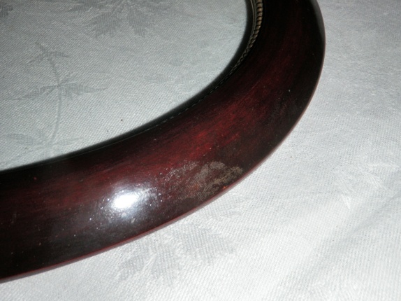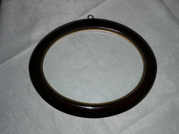 Oval trerammeBrun med gulldekorMed glass og oppheng for vegg på langsiden30 x 24 cm