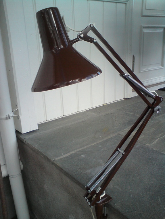 Brun retro skrivebordslampe brukt på verksted.Med holder for bordplate.