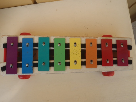 Kjempekoselig zylofon fra Fisher Price,laget i 1964!Denne kan du feste en hyssing i så kan den dras etter gulvet og spiller da nydelig. eller den kan dyttes. Kan også bruke en liten "hammer"og spille med den.Det følger ikke med hyssing eller hammer/stikke. Kassen er i tre og hjulene i plast. Kvalitetsleketøy,og samleobjekt. Utrolig flott!!Sjarmerende slitt på kantene,så denne er nydelig som pynt på barnerommet også.