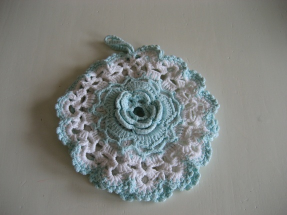 Nydelige vintage/retro heklede grytelapper i hvitt og aqua/mint. Heklet i bomullsgarn