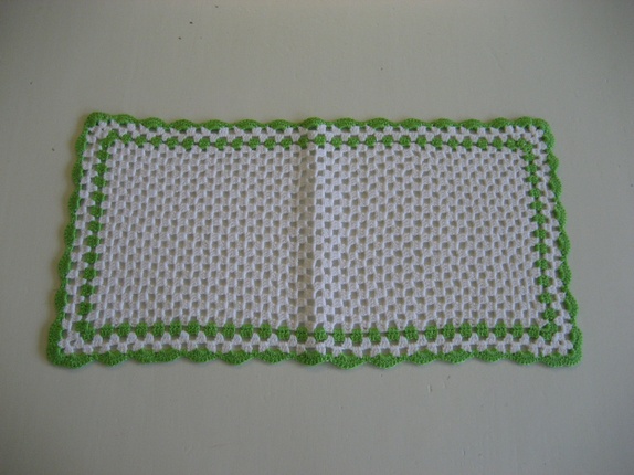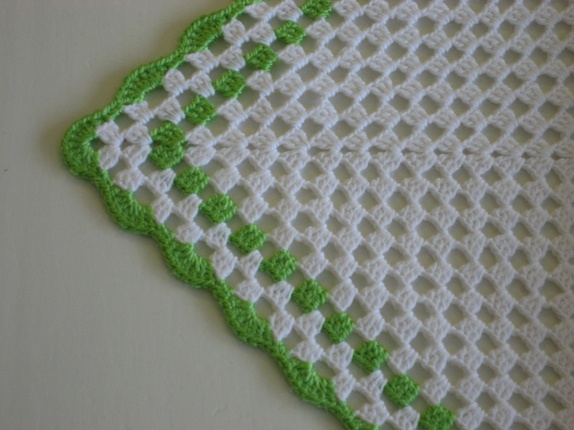 Sett med tre heklede brikker i hvitt og limegrønt.