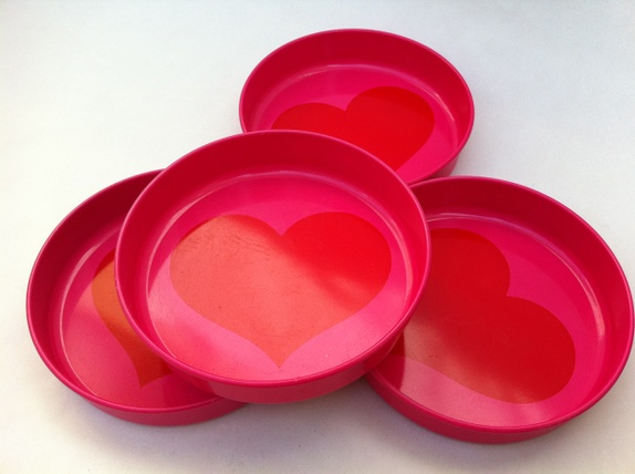 Flotte glassbrikker med hjertemotiv i rødt og rosa.