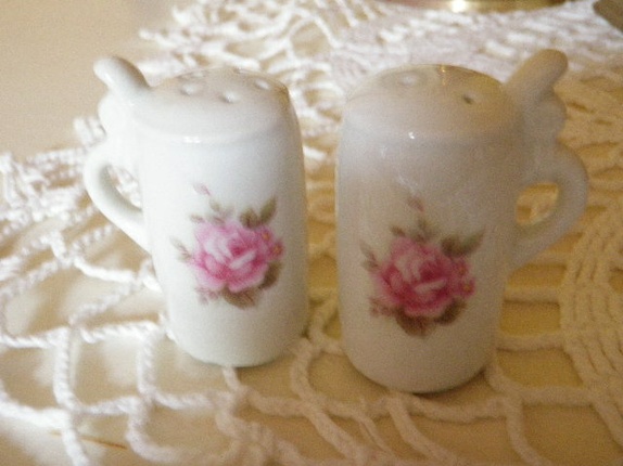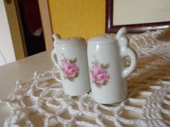 Små og søte salt- / pepperbøsser i porselenHøyde 4,5 cm(det mangler kork i bunnen)