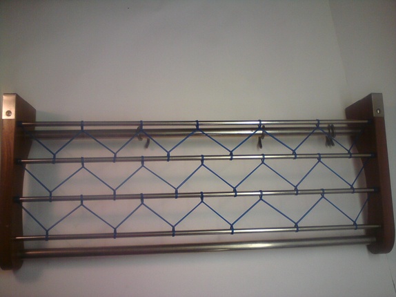 Hattehylle i teak og stål med blått flettet "nett".Hyllen er 70 cm. lang og 30 cm. dyp.4 kroker på stanga innerst ved veggen, stang til kleshengere ytterst.Enkelt oppheng.